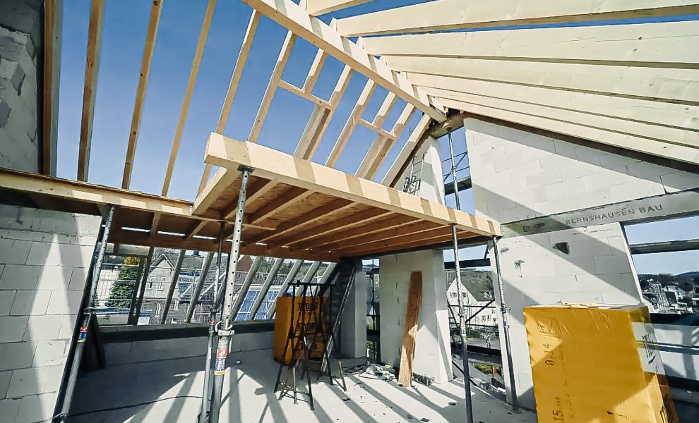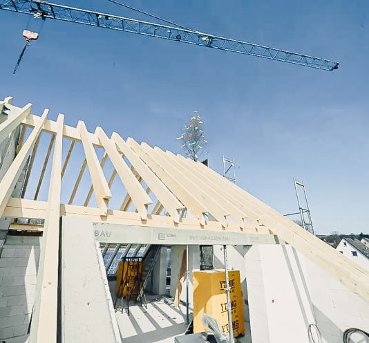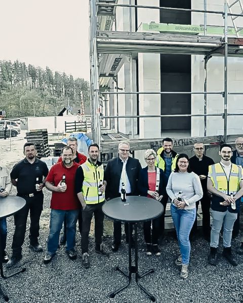 Der Rohbau steht, Der Dachstuhl ist aufgeschlagen. Zum Richtfest kamen u.a. der Vorstand der Wohnungsgenossenschaft Kreuztal, Mitglieder des Planungs-Teams und Vertreter der ausführenden Firmen zusammen.