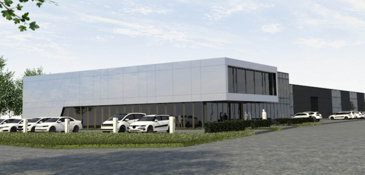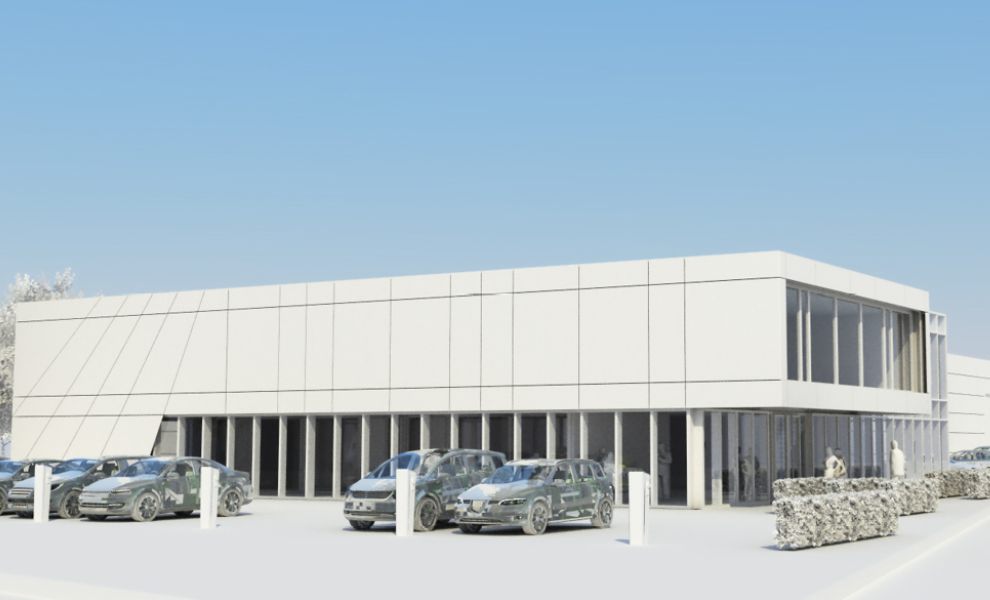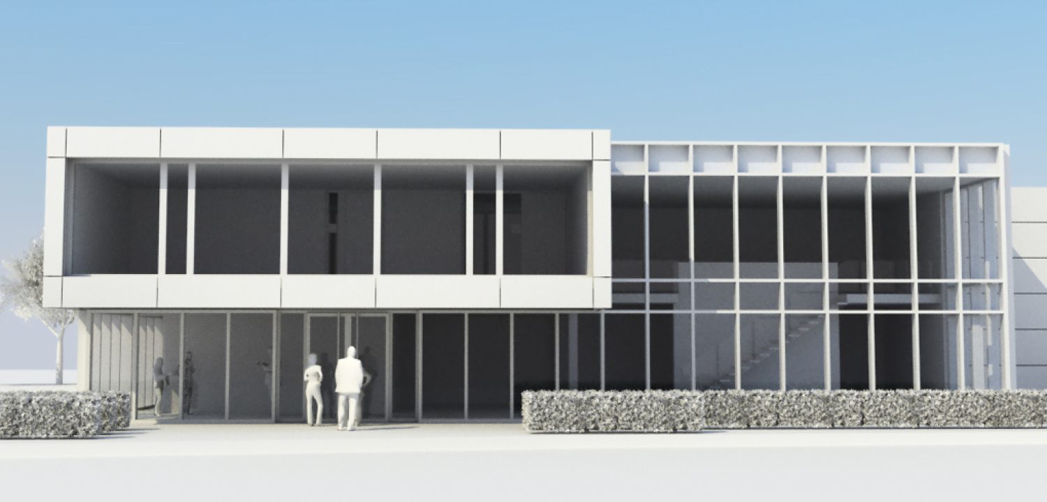 Der Bürotrakt mit einer kleinen integrierten Ausstellung und den Sozialräumen für den Betrieb wurde an der Südwestseite des Geländes neu angeordnet. Hier ist die Hauptzufahrt ins Gewerbegebiet und somit ist die Ausstellung und der Empfang direkt für den Kunden ersichtlich. Der in dieser Variante zurückgebaute bisherige Bürotrakt befand sich auf der der Zufahrt abgewandten Seite. Konstruktiv ist sowohl der Hallenneubau sowie der Bürotrakt in Holzbauweise vorgesehen; Fenster und Pfosten-Riegelkonstruktion in einer Holz-Aluminium-Kombination. Für die Fassade des Bürotraktes haben wir eine Aluminium-Vorhangkonstruktion eingeplant, die einen zweifarbigen leicht reflektierenden Oberflächeneffekt aufweist, um dem Gebäude je nach Blickwinkel eine sich verändernde Oberfläche zu verleihen. Mit unserem Beitrag konnten wir in den Punkten Logistik und Gestaltung überzeugen und erhielten den 1. Platz im Wettbewerb.