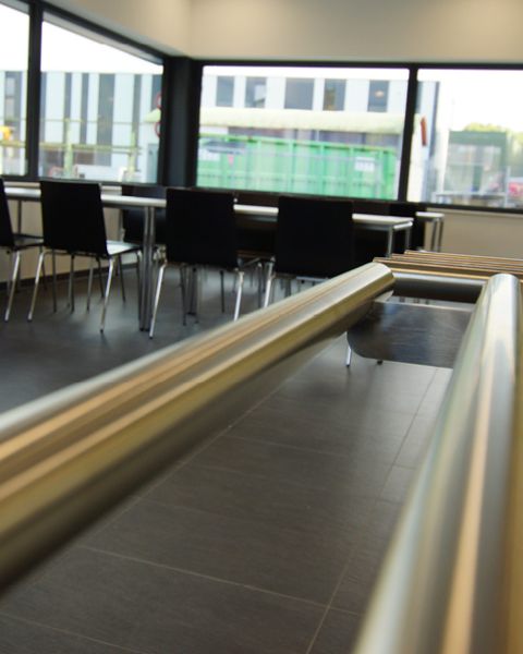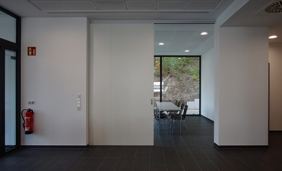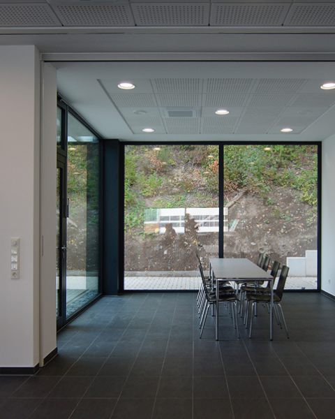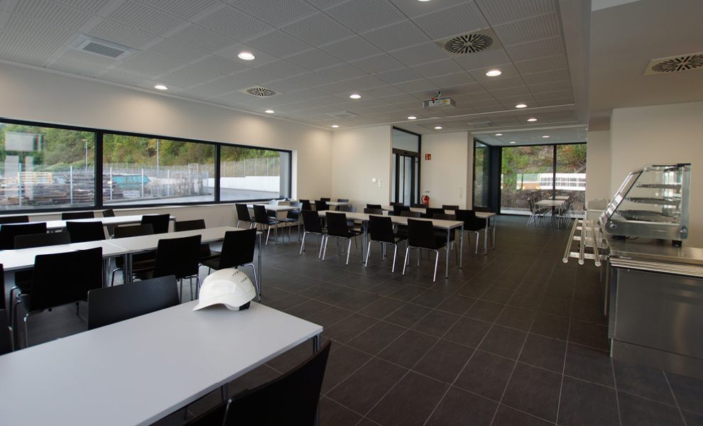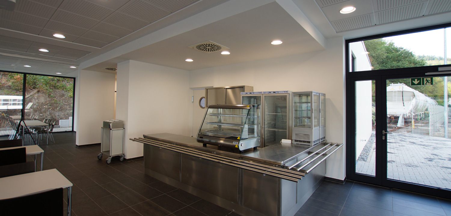 Im Inneren dominiert neben Küche und Ausgabetheke der großzügige und lichtdurchflutete Gastraum, welcher mittels einer mobilen Trennwand unterteilt werden kann, um so einen separaten Bereich für die unterschiedlichsten innerbetrieblichen Meetings zu schaffen, ohne den eigentlichen Betrieb der Kantine zu stören.