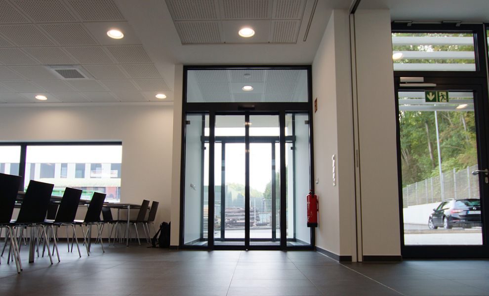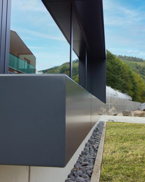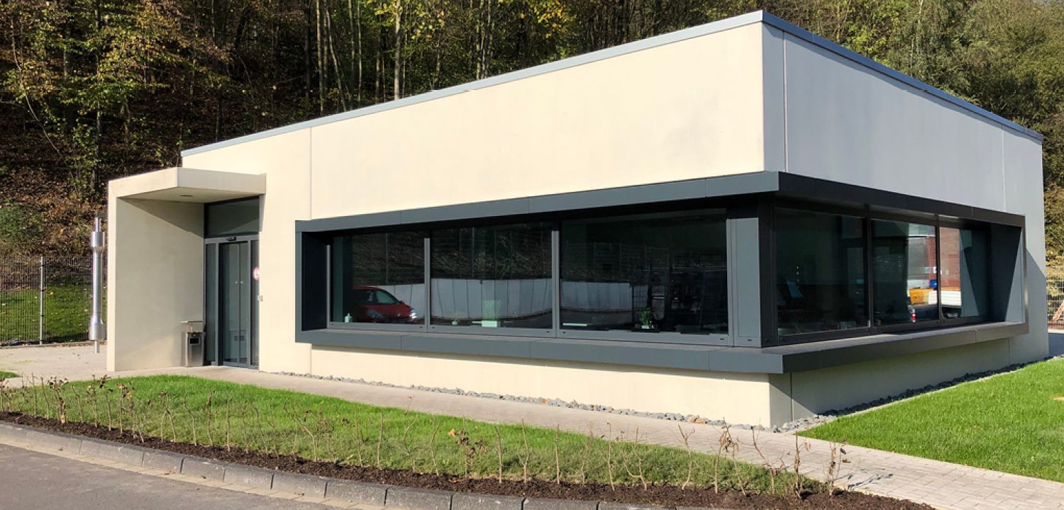 Die Fassadengestaltung mit Sandwichelementen aus Sichtbeton war einerseits gestalterisch gewünscht und reagiert zusätzlich durch die robuste und pflegeleichte Oberfläche auf den unmittelbar am Gebäude entlangführenden Werksverkehr. Unter anderem durch die Bauweise aus Stahlbetonfertigteilen konnte zudem die auftraggeberseitig geforderte kurze Bauzeit von nur 7 Monaten realisiert werden.