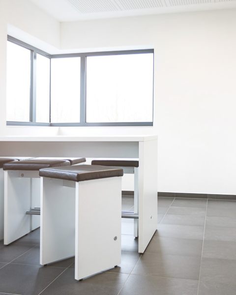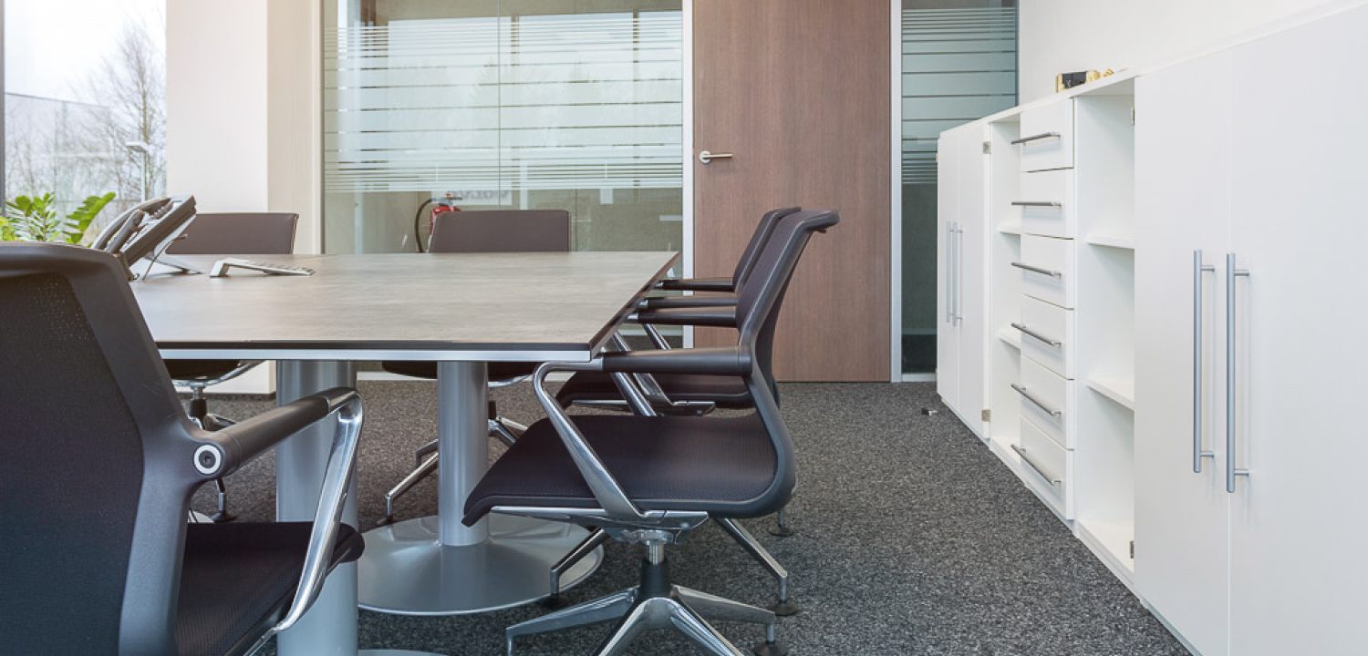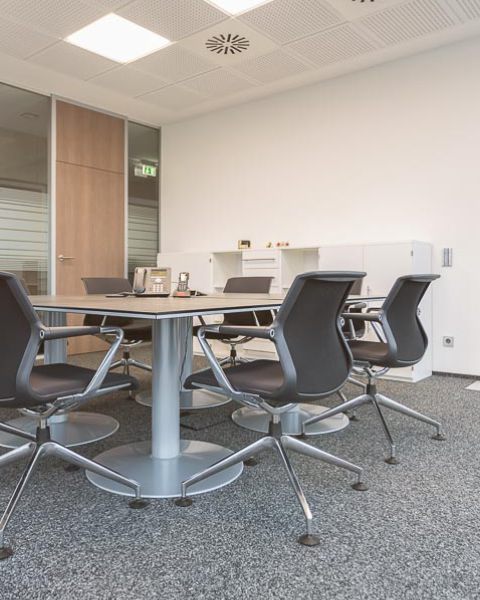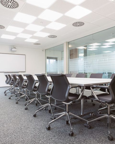 Trotz dieser sehr offenen Gestaltung bieten die Arbeitsplätze durch das sorgfältig ausgesuchte Mobiliar und die Gestaltung der Glas-System-Trennwände mit semi-transparenten Streifen ein ausgewogenes Verhältnis zwischen Privatsphäre zum ungestörten Arbeiten und Offenheit für das Arbeiten im Team.