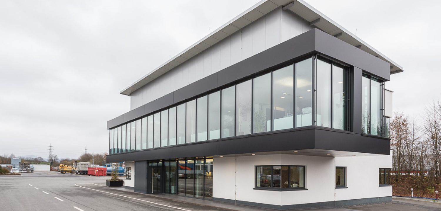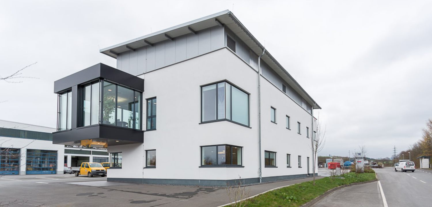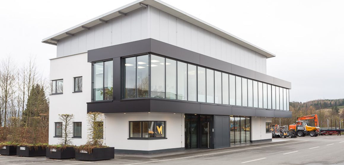 Das Bürogebäude der Firma maschinen + technik Sauerland GmbH & Co. KG besticht durch das Zusammenspiel des geschlossenen monolithischen Massivbaukörpers und des auskragenden, raumhoch verglasten Büroriegels, der den Überblick über das komplette Firmengelände eröffnet.