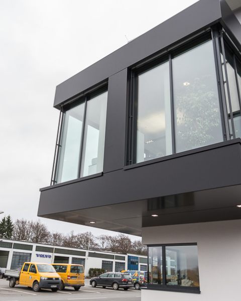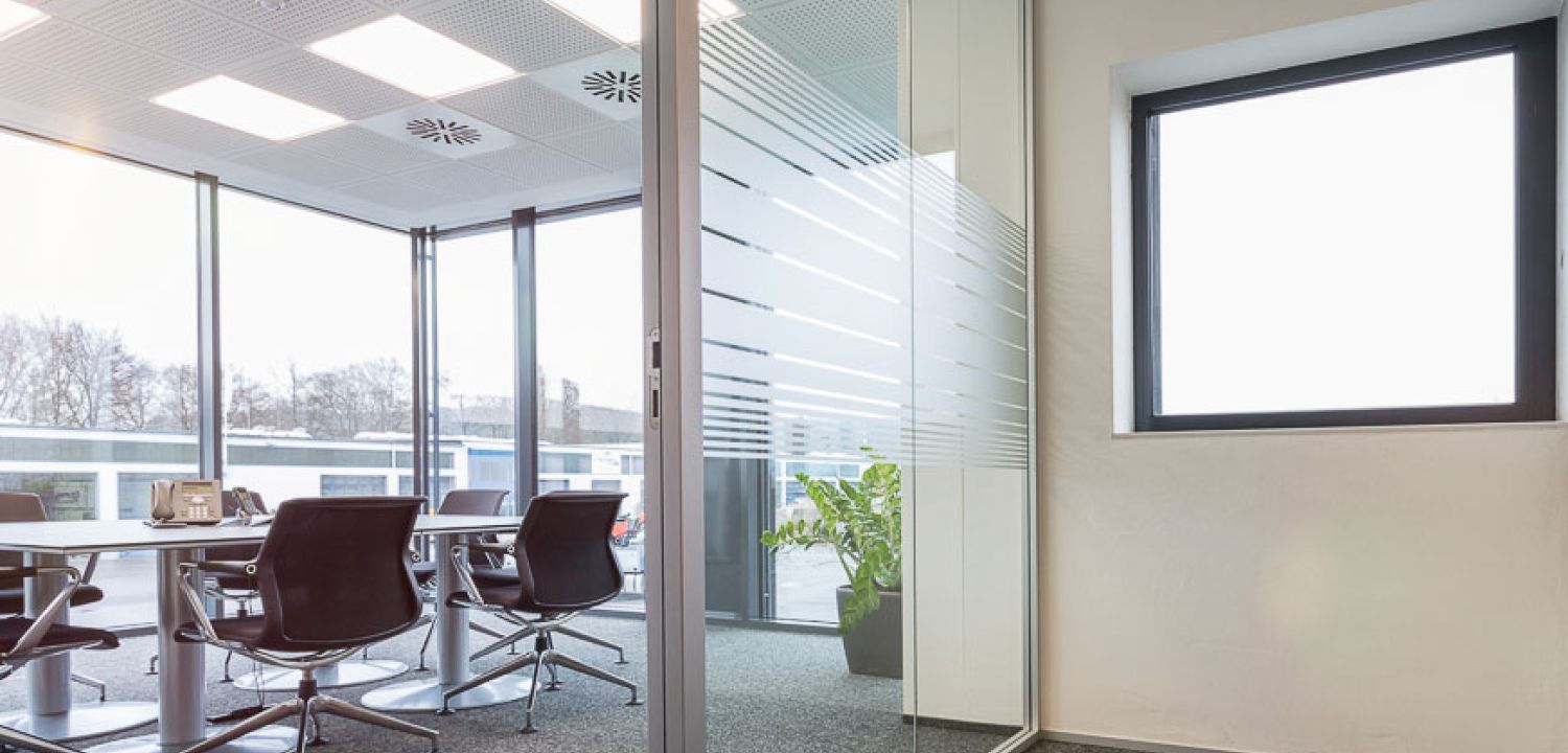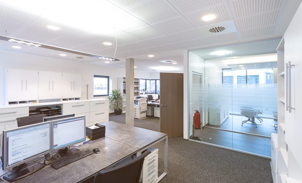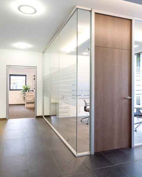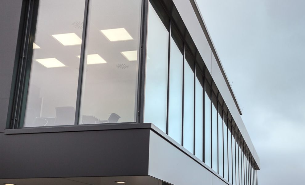 Im Büroriegel des Obergeschosses wurden die Trennwände der Büros untereinander zur Fassade hin mit einer Art Schwertanschluss aus Glas ausgeführt, um von außen den Eindruck einer komplett durchgehenden Glasfassade zu erhalten.