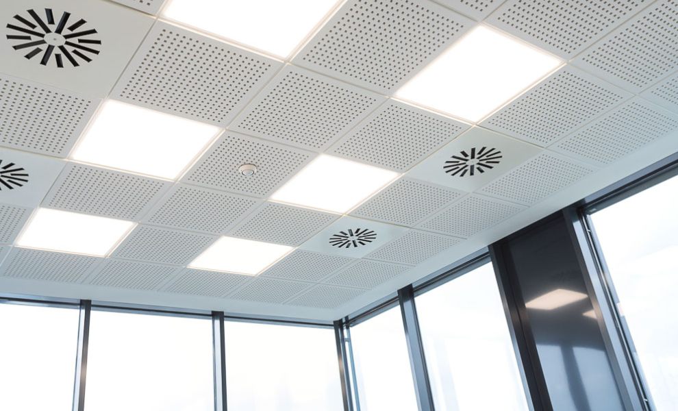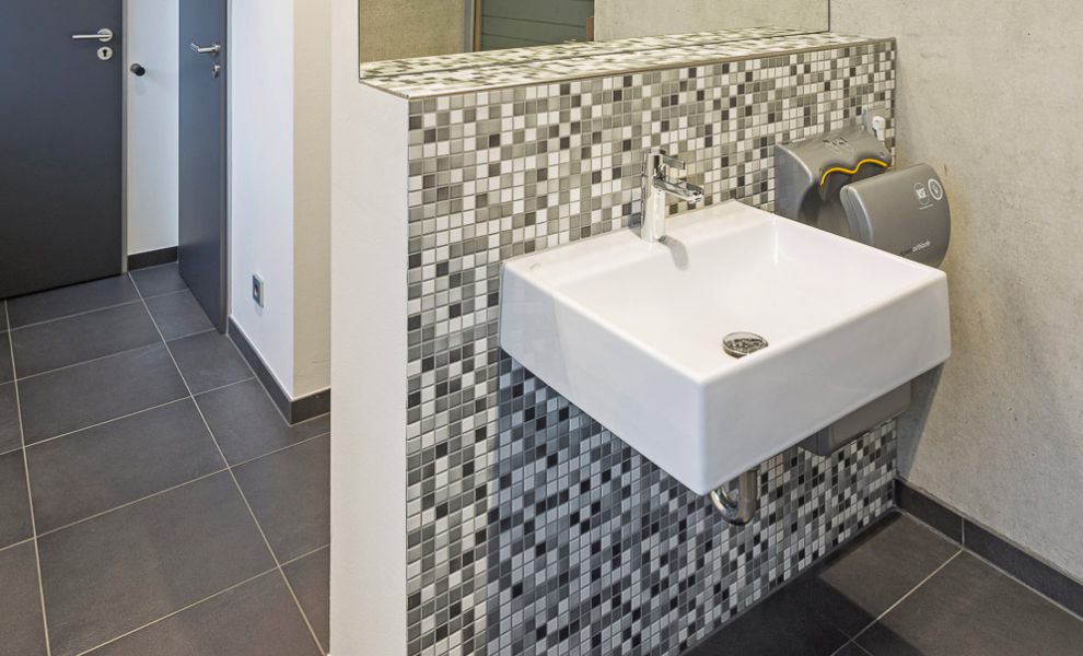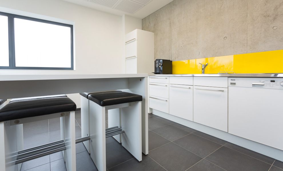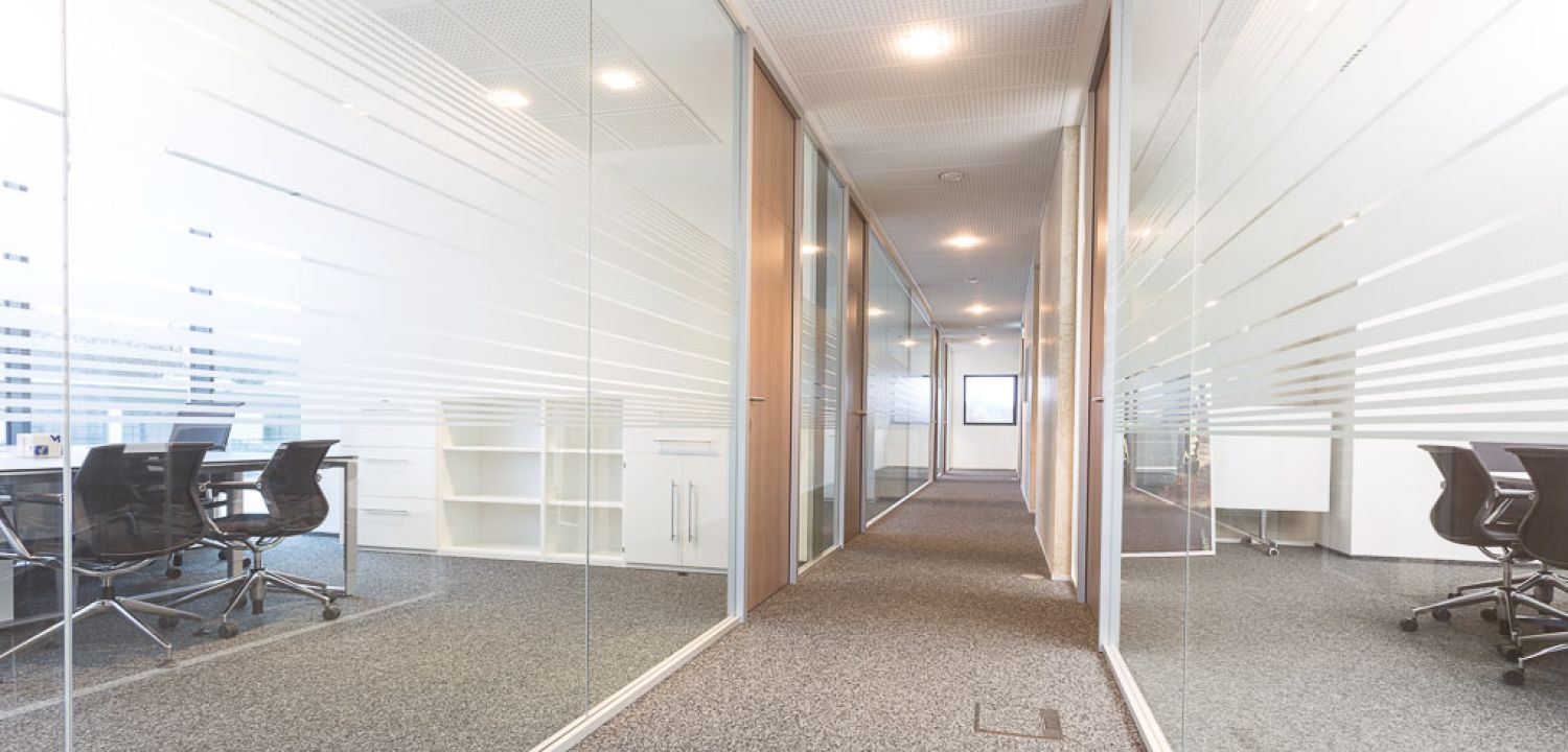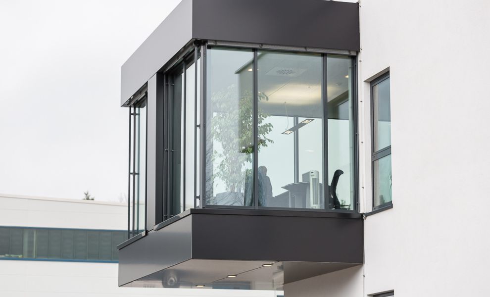 Im Büroriegel des Obergeschosses wurden die Trennwände der Büros untereinander zur Fassade hin mit einer Art Schwertanschluss aus Glas ausgeführt, um von außen den Eindruck einer komplett durchgehenden Glasfassade zu erhalten.