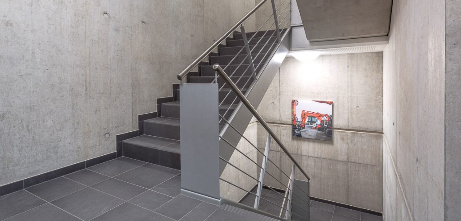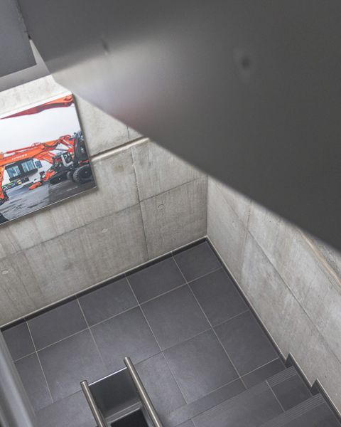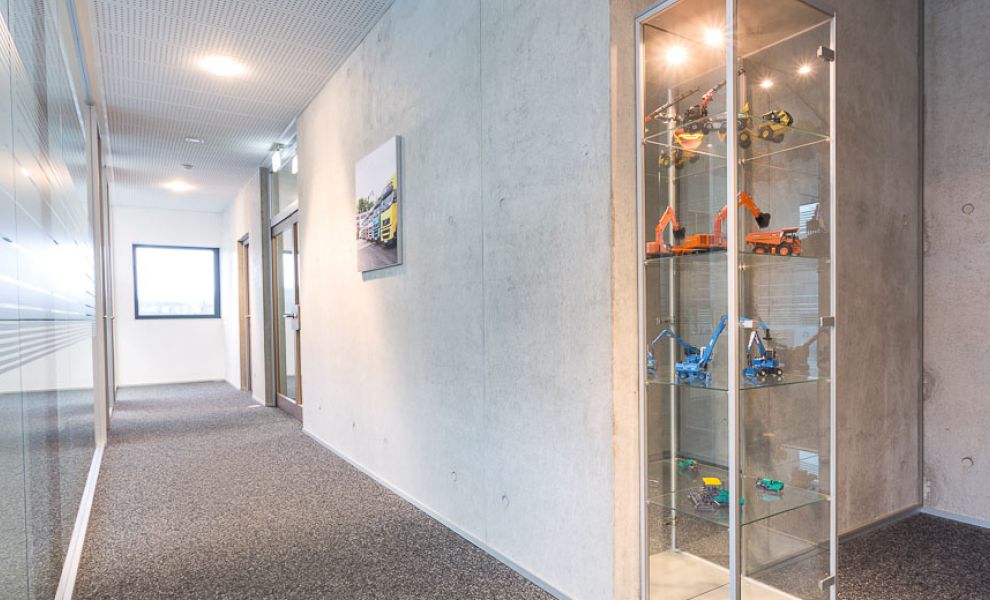 Der Innenbereich wurde konsequent auf wenige hochwertige Materialien wie z.B. Sichtbeton, Lehmputz und eigens entwickelte Glas-Systemtrennwände reduziert. Besonders ist der gänzliche Verzicht auf Öffnungsflügel in der Fassade. Das Thema Transparenz war dem Bauherrn sehr wichtig. So wurden alle Wände der Büro- und Besprechungsräume zum Flur hin verglast.