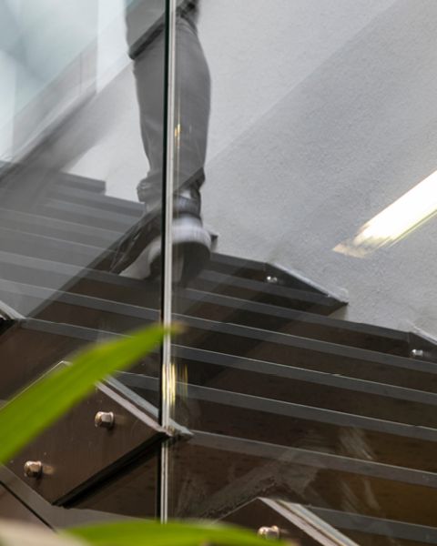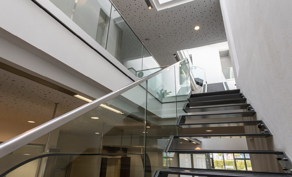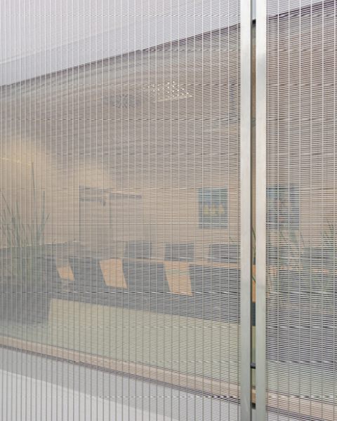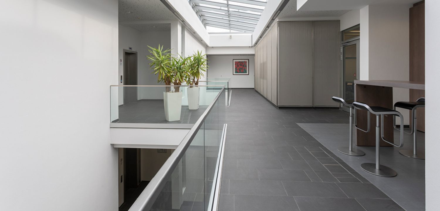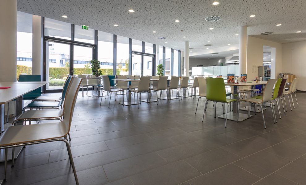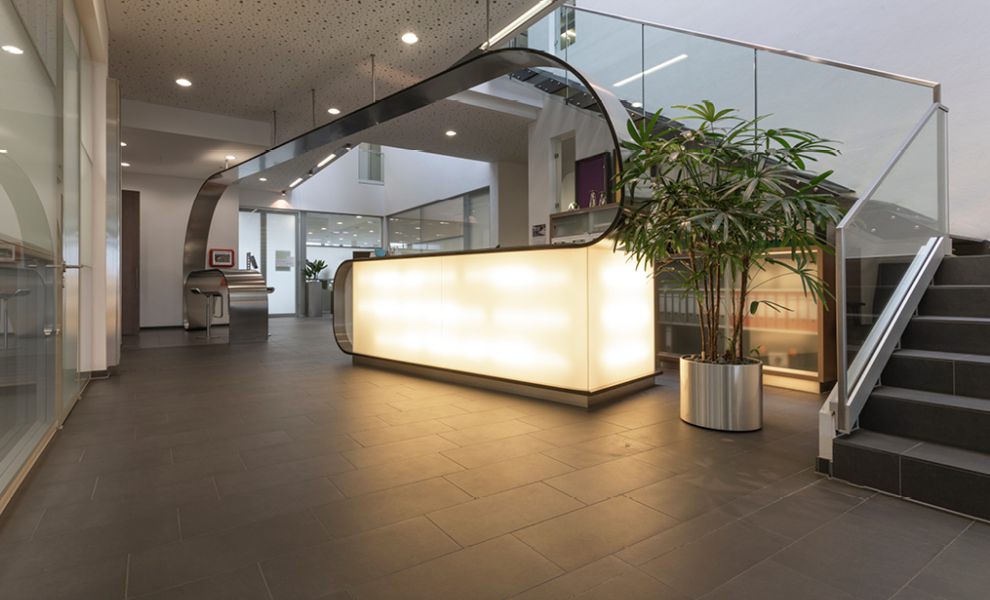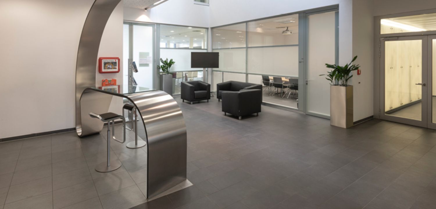 Im Erdgeschoss befinden sich zusätzliche Bereiche wie z.B. die Betriebskantine, die komplette Gebäudetechnik und auch die Sozialräume für die Mitarbeiter und Mitarbeiterinnen im Produktionsbereich. Das Gebäude verfügt über eine Kombination aus Lüftungsanlage und Heiz-Kühl-Decken, wodurch ganzjährig ein sehr gleichmäßiges Raumklima ermöglicht wird. Für den zentralen Anlaufpunkt im Forum wurde eine Empfangstheke in Anlehnung an ein „abgewickeltes Coil“ als „Band“ mit einer Edelstahloberfläche entworfen, das im weiteren Verlauf in den Stehtisch der Teeküche übergeht.