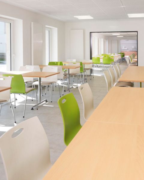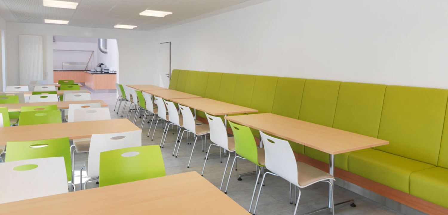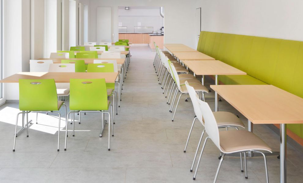 Im Anschluss an das neue Foyer des Musikbildungszentrums entstand eine neue Mensa im Bestandsgebäude. Die Küche wurde komplett umstrukturiert und erneuert.