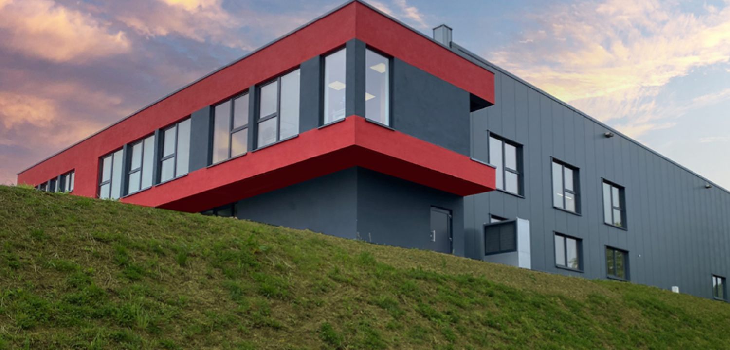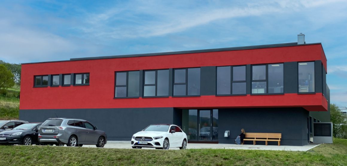 Das Grundstück befindet sich in einem Gewerbegebiet in Freudenberg. Aufgrund der vorhandenen Topografie musste das Gelände mit einem Höhenunterschied von fast 12 Metern zuerst terrassiert werden, um überhaupt eine Bebaubarkeit herzustellen.