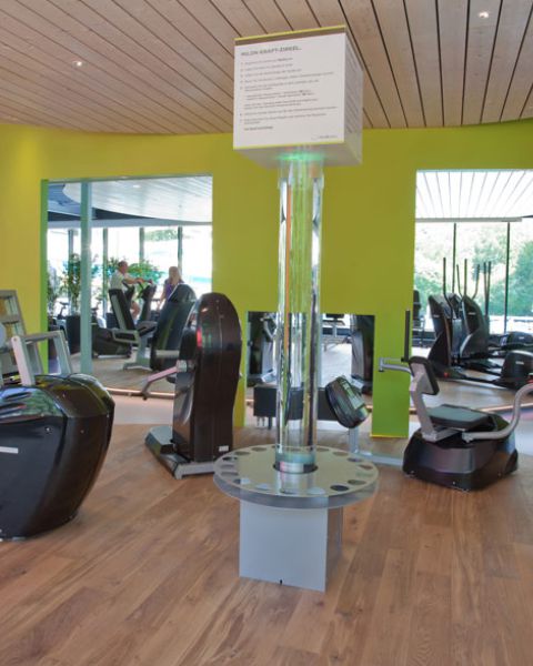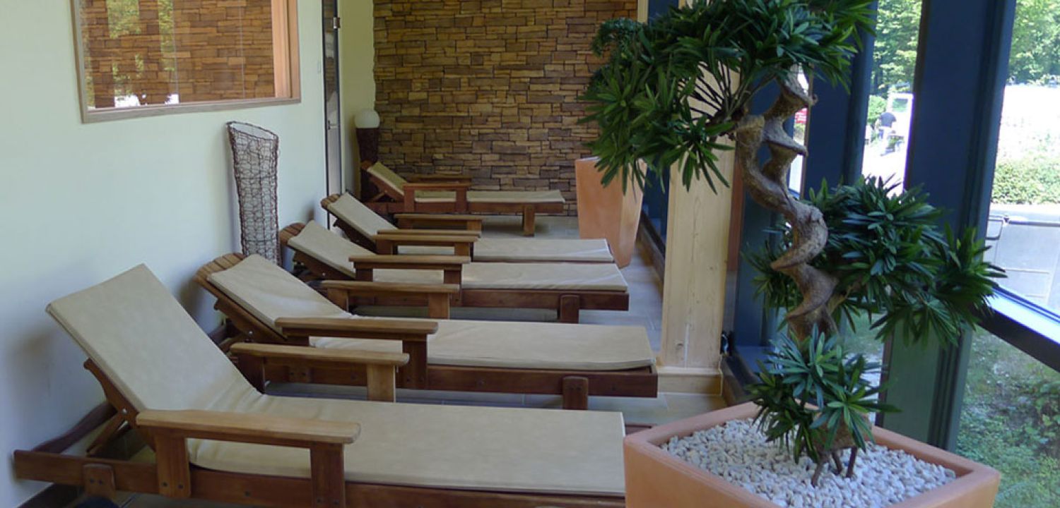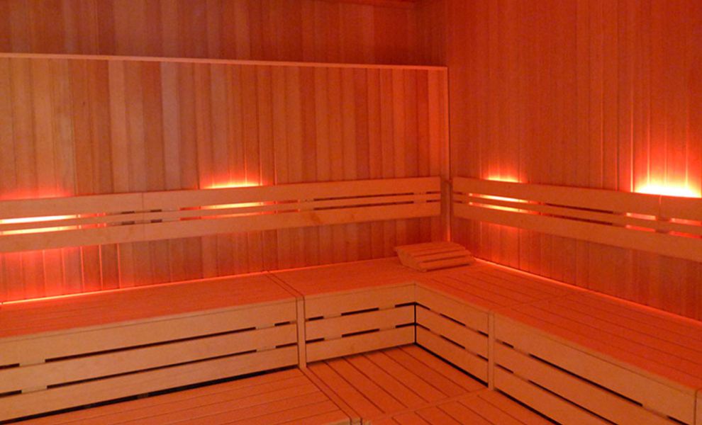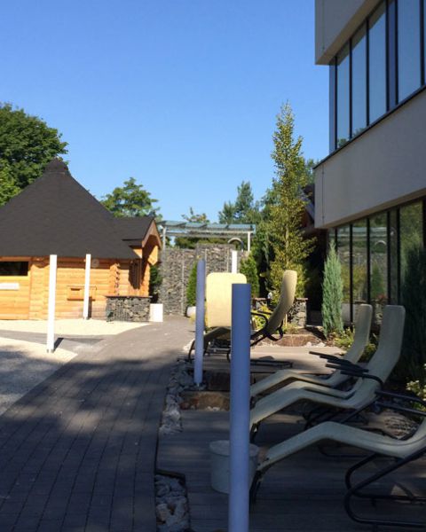 Der neue großzügige Saunabereich inklusive Panorama-Sauna wurde als Neubau auf der ehemals im Kellergeschoss gelegenen Sauna errichtet und um einen Außensaunabereich erweitert. Die Innengestaltung wurde bewusst in warmen erdigen Tönen gehalten und auf die sichtbare Holzkonstruktion abgestimmt. Die Belichtung der Aufenthaltszone, von der aus alle Einzelbereiche zugänglich sind, erfolgt ausschließlich von oben, während sich der Ruheraum über eine großzügige Glasfassade zum Außenbereich hin öffnet.
