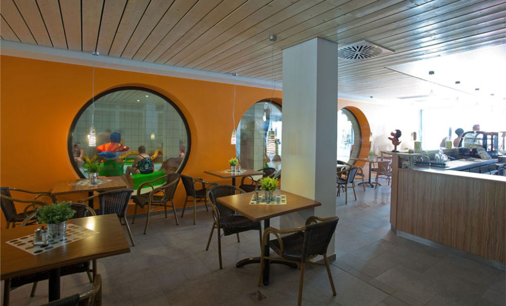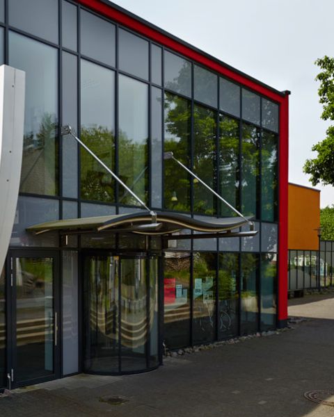 Alle Funktionsbereiche sind durch das großzügige offene Foyer mit angeschlossenem Bistro miteinander verbunden. Die Außengestaltung wurde bei den verschachtelt angeordneten Bauteilen auf wenige Farben reduziert. Die Schwimmhalle als Hauptbaukörper ist weiß verputzt. Sauna und Fitnessbereich setzen sich in einem kräftigen Orange ab und die Seitenwände des Foyers erscheinen in einem strahlenden Rot. Die Fensterrahmen und Pfosten-Riegel-Konstruktionen nehmen sich in anthrazit zurück. Auf der Seite des Haupteingangs zieht sich eine Welle aus semitransparenten Bereichen über die komplette Glasfassade.