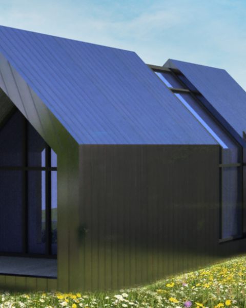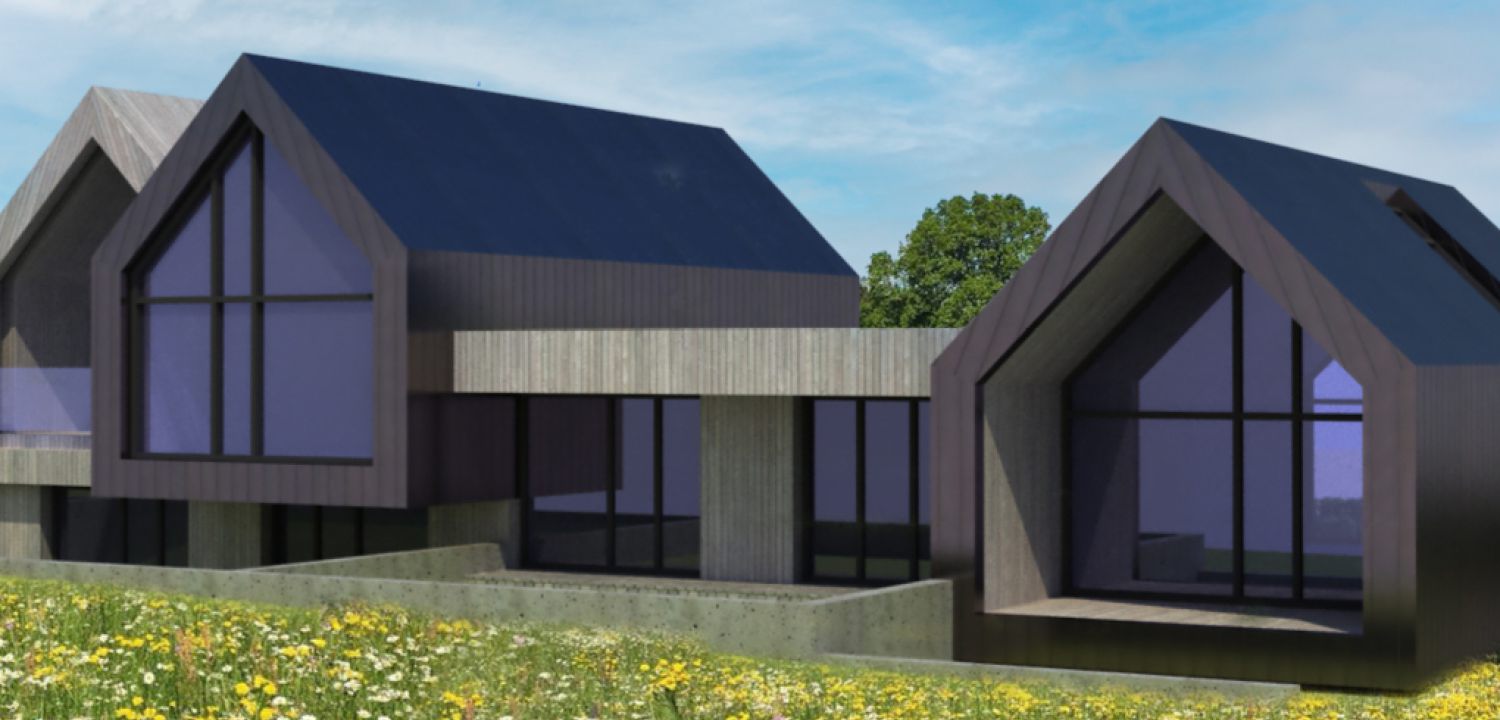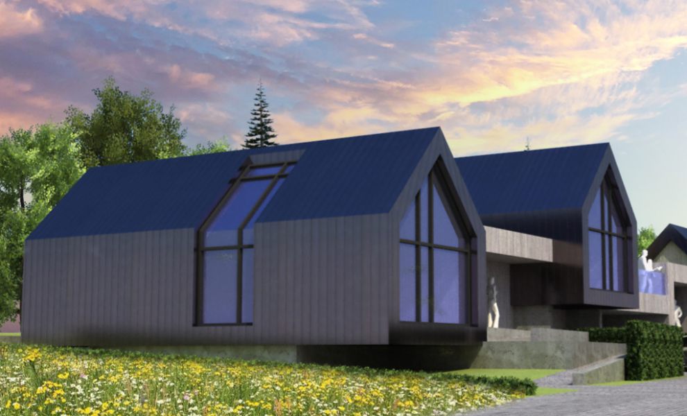 Der Wohnbereich mit offener Küche wurde jeweils in einem 5m breiten Riegel mit angeschlossener überdachter Terrasse angeordnet. Der Baukörper ist als offener Raum mit Satteldach vorgesehen, wodurch ein optisch sehr großzügiger Eindruck entsteht. Dach und Fassadenverkleidung sind aus dem gleichen Material und gehen ineinander über.
