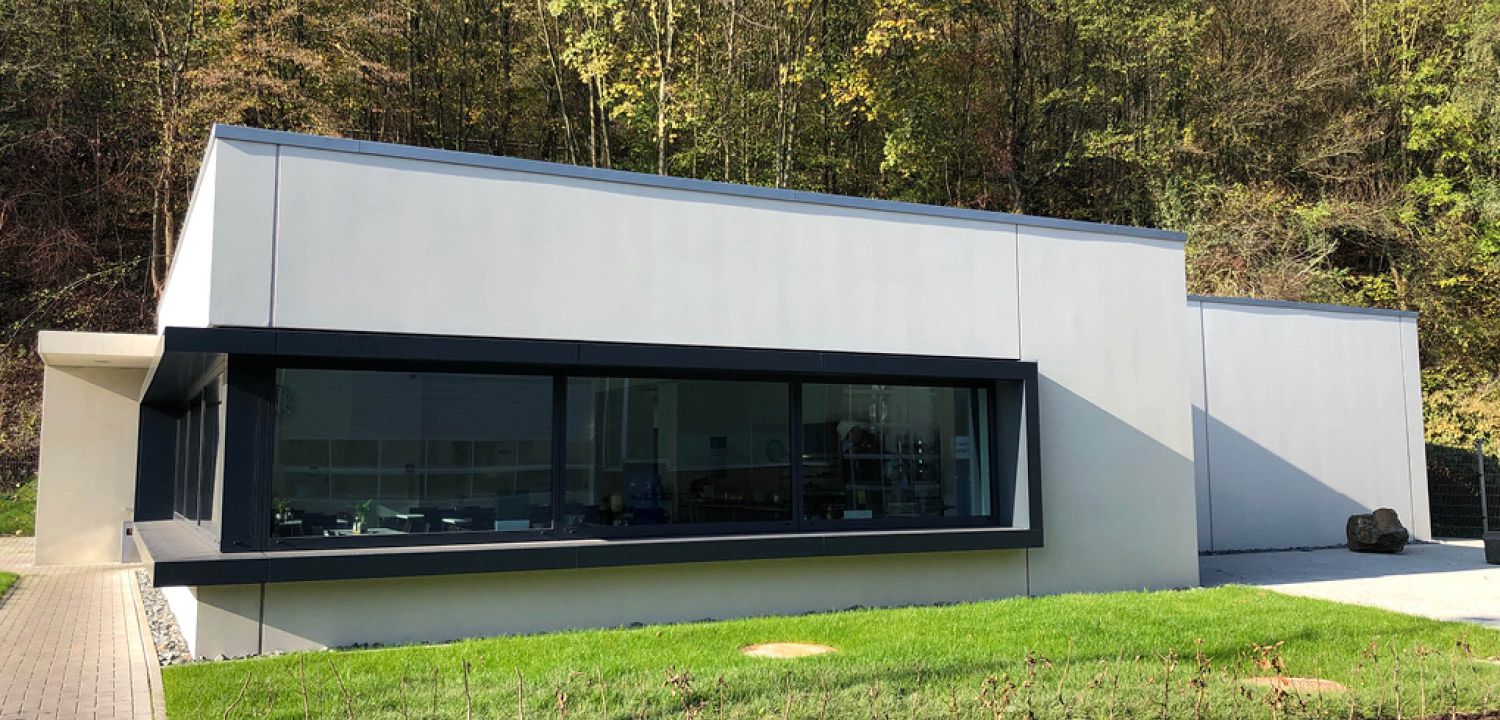Im Essbereich wird dieser monolithisch wirkende Körper durch eine Art Wintergartenverglasung unterbrochen, wodurch insgesamt ein lichtdurchfluteter heller Raum entsteht. Schlaf- und Nebenräume sowie Bad sind in einem eingeschossigen Baukörper mit begrüntem Flachdach untergebracht. Die Wohnbaukörper der südlichen und mittleren Einheit orientieren sich Richtung Wald. Der Wohnbereich der nördlichen Einheit ist aufgrund des eng zulaufenden Baufeldes in Nord-Süd-Richtung. In der mittleren Einheit ist der Flachdachbaukörper insgesamt größer, da er zusätzlich überdachte Stellplätze beinhaltet, und liegt unterhalb des Wohnbereichs. Aufgrund der Topografie des Geländes liegt die mittlere Einheit etwa ein halbes Geschoss versetzt zu den beiden äußeren Einheiten. Hierdurch ergibt sich zur unterschiedlichen Ausrichtung der markanten Baukörper zusätzlich auch eine attraktive Höhenstaffelung des Ensembles.